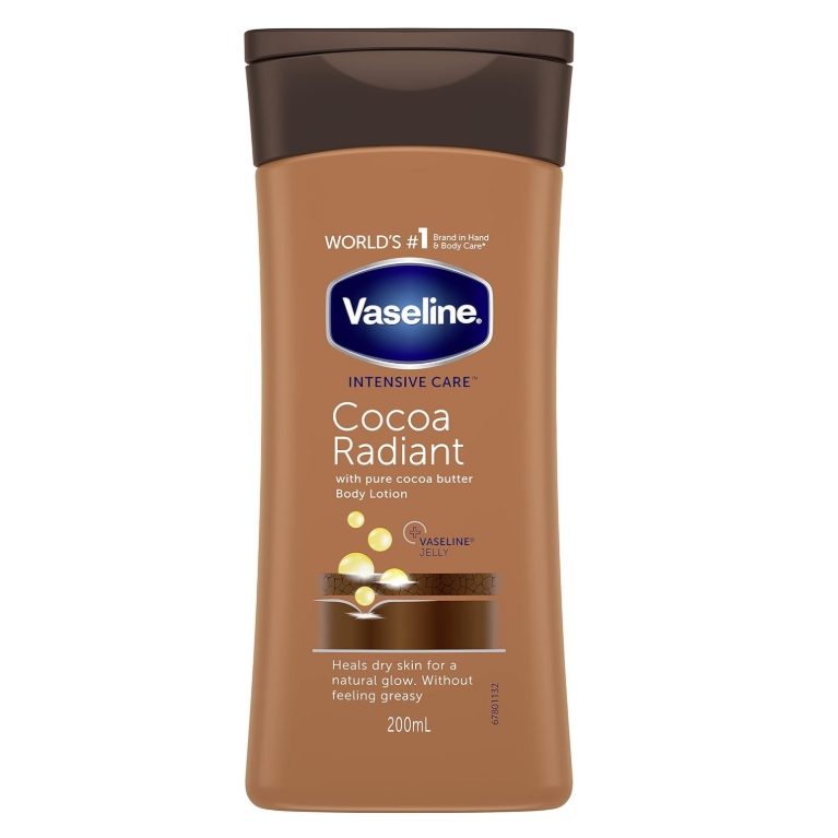 - Vaseline Essential Moisture Cocoa Radiant Lotion est une crème corporelle riche qui nourrit les peaux sèches tout en révélant leur éclat naturel. Sa formule légère et rapidement absorbée offre une hydratation en profondeur sans sensation graisseuse, idéale pour une utilisation quotidienne après la douche.